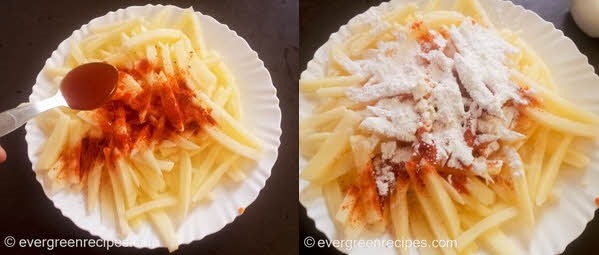 1. Peel of the skin of potato and cut into a thin strip, like finger chips. Take the cut potato in a plate and add red chilly powder, salt, red chilly sauce, tomato sauce and corn flour.