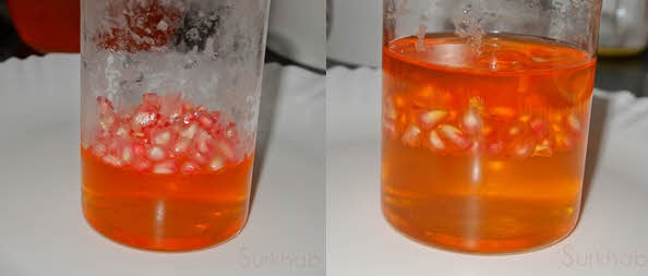 4. Keep it in the fridge for 10 minutes. Then take it off from the fridge and add 3 teaspoon of pomegranate arils. Now again pour small amount of jelly liquid and keep it in the fridge. Repeat the same process. Now the pomegranate jelly is ready and before serving refrigerate for 10 minutes.