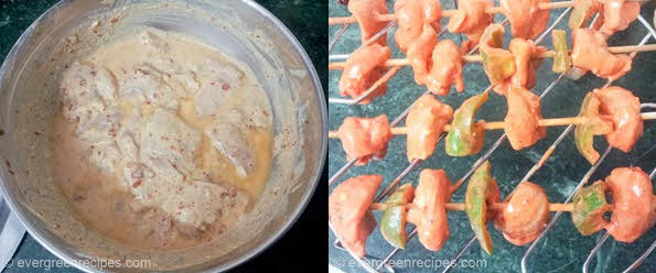 1.Cut the chicken and capsicum into small cubes. In a medium bowl, combine all the ingredients given under table except chaat masala and skewers. Cover it and refrigerate for overnight. Thread chicken and capsicum onto skewers and discard the marinade. Grill it for about 10-12 minutes on each side. Chicken tikka is ready, sprinkle some chaat masala over it and serve hot with green chutney.